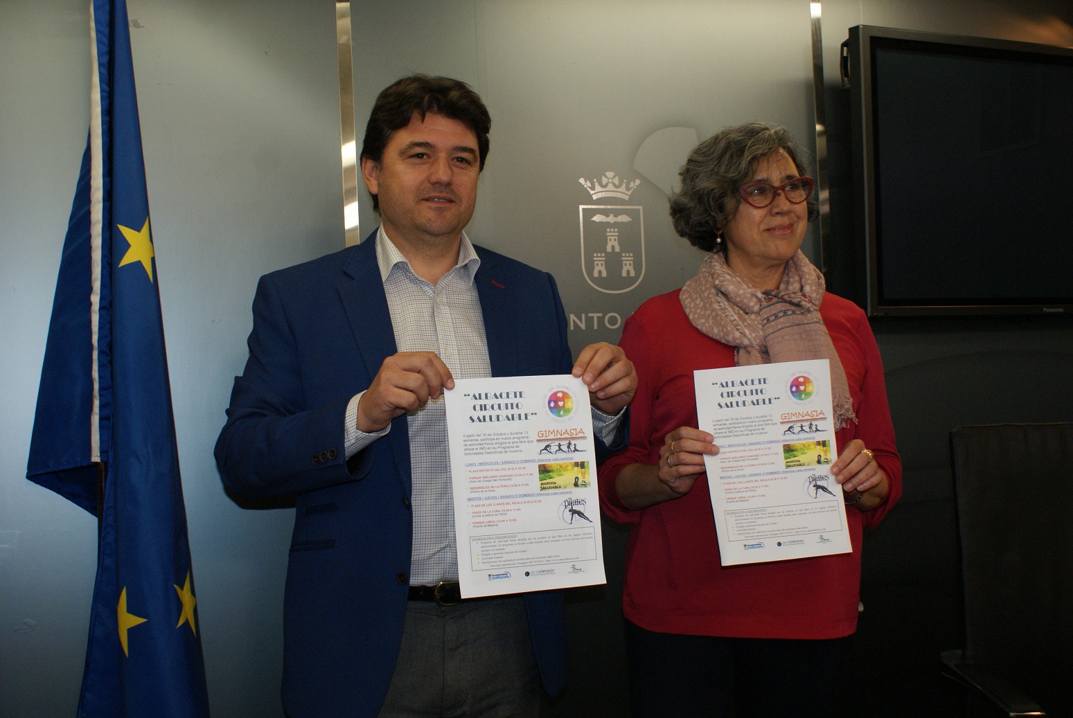 El concejal de deportes en el Ayuntamiento de Albacete, Francisco Navarro junto a la concejal del grupo municipal “Ganemos Albacete”, Lola del Olmo han presentado el nuevo programa de actividad física dirigida al aire libre que ofrece el IMD en su programa de actividades de invierno “Albacete Circuito Saludable”.