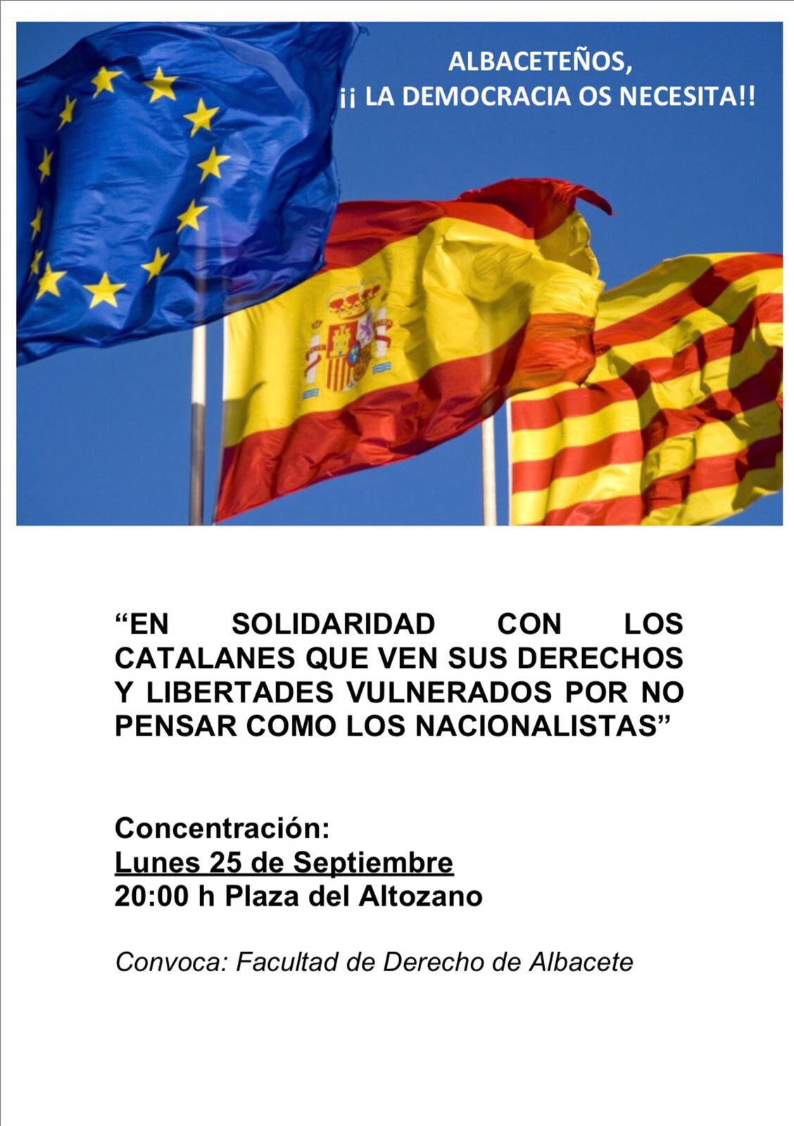 Por esta razón hemos convocado al pueblo de Albacete, a través de sus instituciones civiles y sociales, a manifestarse pacíficamente el próximo lunes 25 en la Plaza del Altozano a las 20 horas, con un único lema: “En solidaridad con los catalanes que ven sus derechos y libertades vulnerados por no pensar como los nacionalistas”. La concentración o manifestación, dependiendo de los ciudadanos que acudan a la convocatoria (todos y cada uno de nosotros podemos contribuir), finalizará con la lectura de un breve manifiesto, redactado en términos similares a lo aquí contenido.