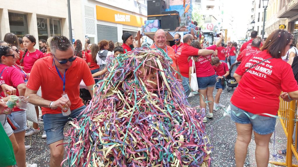 Miles de albacetelos han participado en la tradicional Batalla de Flores que ha llenado de animación y color las calles de Albacete en esta mañana ferial del Día de la Patrona.