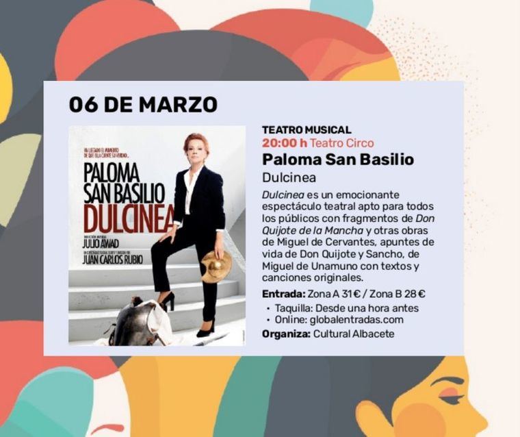 El Teatro Circo de Albacete acogerá mañana una de las citas más destacadas de la programación cultural del ciclo ELLAS con la representación de Dulcinea, el nuevo espectáculo teatral protagonizado por Paloma San Basilio. La función dará comienzo a las 20:00 horas y se enmarca dentro de la agenda cultural impulsada por el Ayuntamiento con motivo del mes de marzo.
