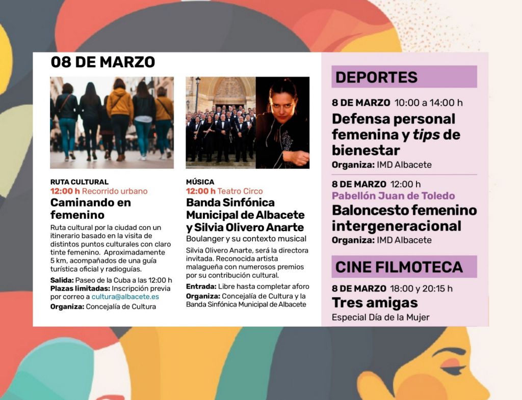Con motivo del Día Internacional de las Mujeres, el Ayuntamiento de Albacete ha programado para mañana, 8 de marzo, una jornada que combina cultura, deporte y participación ciudadana dentro de la agenda de actividades impulsada durante el mes de marzo para visibilizar el papel de las mujeres en distintos ámbitos de la sociedad. La ciudad acogerá a lo largo del día diversas propuestas abiertas al público que ponen en valor el talento femenino, fomentan la convivencia y refuerzan el compromiso institucional con la igualdad.